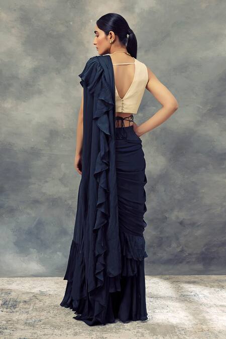 Blue Georgette, Satin Crepe V Neck Pre-draped Layered Ruffle Saree