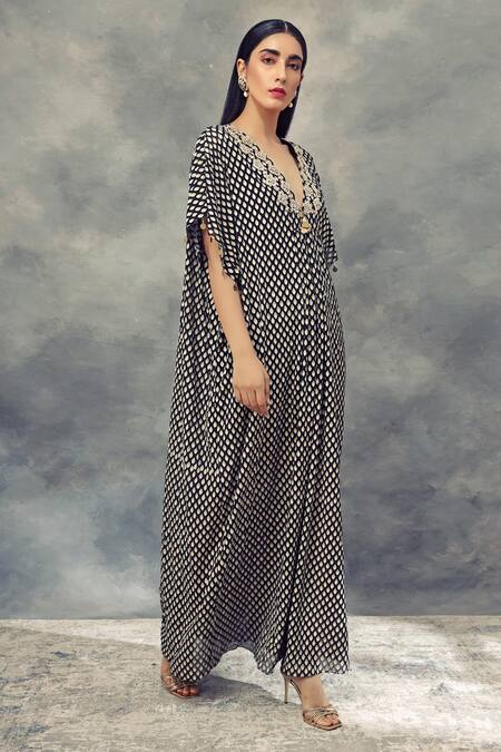 Black Georgette V Neck Printed Kaftan