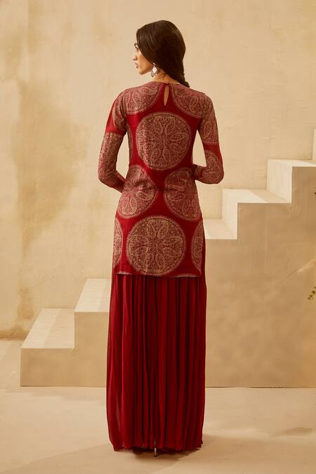 Red straight short kurta with circle print motif & pearl and emerald green stone embroidered neckline. Paired with georgette flared pants. This outfit is understated and gorgeous at the same time.