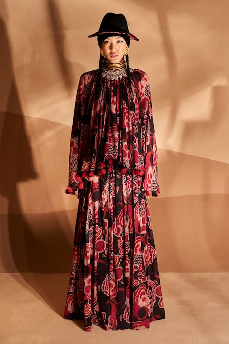 Black poncho top featuring all-over gulbahar print, embroidery on the neckline, and tassels at the hem. Paired with coordinating flared pants for a complete look.