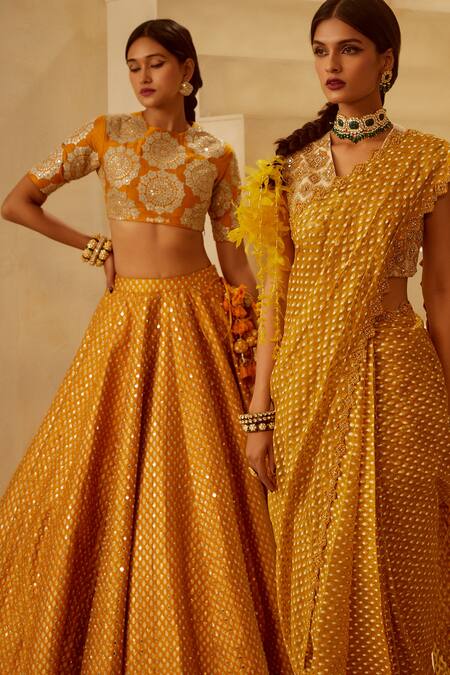 Yellow printed pre-draped saree with embroidered scallop hem. Paired with geometric hand embroidered blouse in mirror and pearl work.