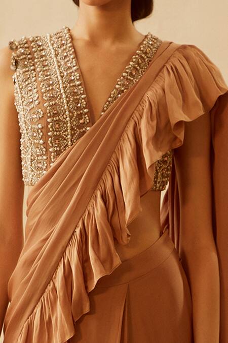 Beige pre-draped saree with layered ruffles. Paired with an embroidered blouse in stone and pearl work.