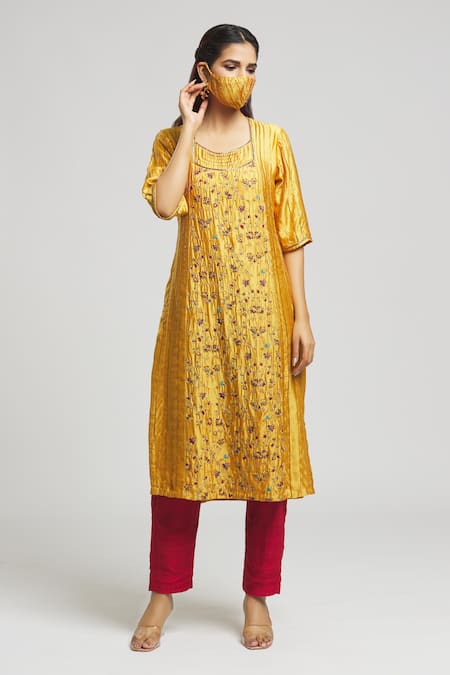 Yellow kurta featuring floral sequin and cutdana embroidery with elbow sleeves. Paired with a matching pant and mask.