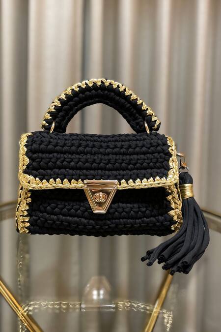 Braided textured detailing with contrast border, Gold-tone hardware accents, Tassel detailing for added flair
