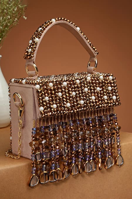 Hand embroidery with crystals and pearls, Fringe detailing at the bottom, Unique box shape design