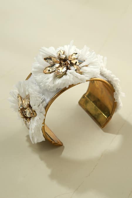 White cuff bracelet featuring soft raffia floral accents and crystal embellishments