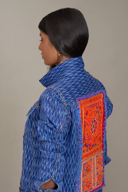 Blue denim jacket with ikat woven, patchwork embroidery & patch pocket.