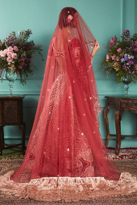 Red Silk, Net Pearls, Zari Sweetheart Zardosi Embroidered Bridal Lehenga Set
