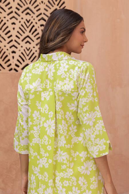 Green shirt featuring a collared neck and three quarter sleeves, crafted in cotton silk with an all-over floral print. Paired with coordinating floral print trousers for a complete look.