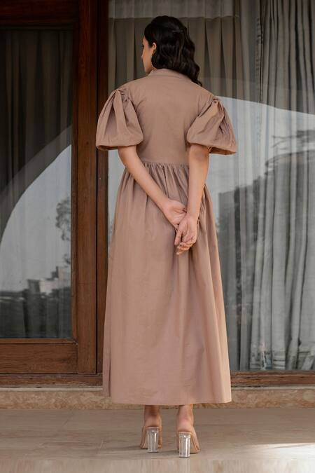 Buy_B'Infinite_Brown Cotton V-neck Balloon Sleeve Midi Dress_at_Aza_Fashions