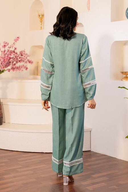 Blue Linen Lace Collared Embellished Shirt And Pant Set