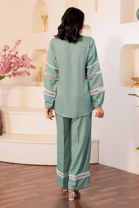 Blue shirt featuring ivory lace embellishment on puffed sleeves