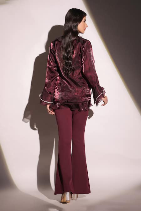 Wine organza top featuring ruffle details and flared sleeves. Paired with a matching wine trouser for a complete look.