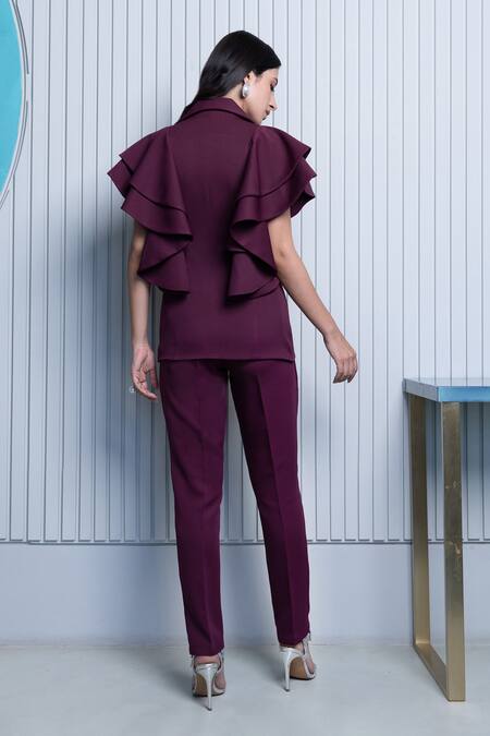 Wine Crepe Plain Notched Lapel Collar Ruffle Top And Trousers Set