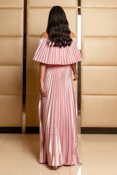 Pink satin gown with pleats and a cape style bodice.