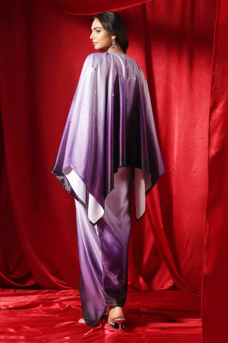 Purple shaded embellished asymmetric cape featuring a round neckline and cape sleeves. Paired with a bralette and draped skirt made of satin fabric.