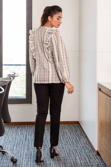 Grey cotton shirt with striped pattern & ruffle detailing. Paired with black trouser.