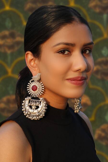 Silver chandbalis featuring carved bird motif on top, embellished with stones and pearls in the center