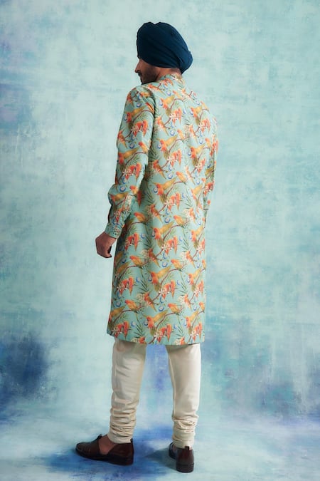 Aqua blue kurta with bird print pattern. Paired with off-white churidar.