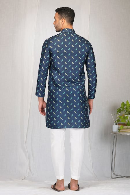 Dark blue kurta featuring an all-over bird print, stand collar, and full sleeves. Paired with white straight-fit pants, the set includes side pockets and a half button placket for added detail.