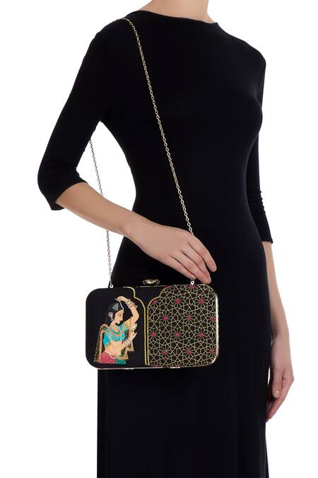 Black box clutch with placement Mughal queen motif hand painted detail. Comes with detachable sling chain.
