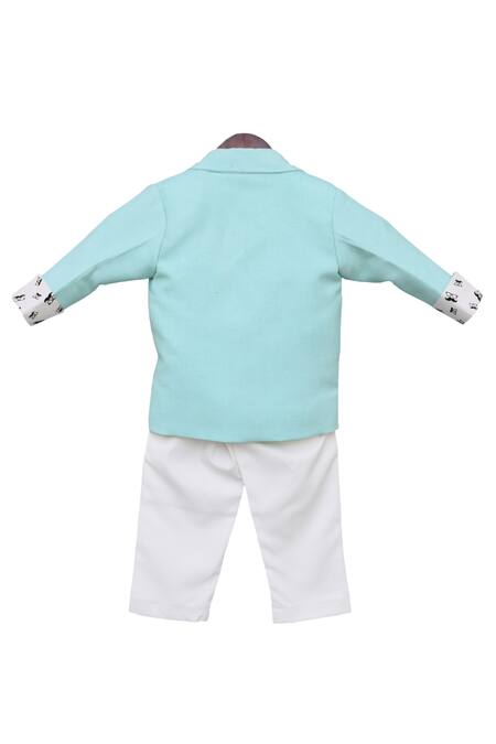 Suit up your little kid in Bollywood style to a wedding-reception party, wearing this white shirt & pant. It is teamed up with a vibrant sea green blazer jacket.