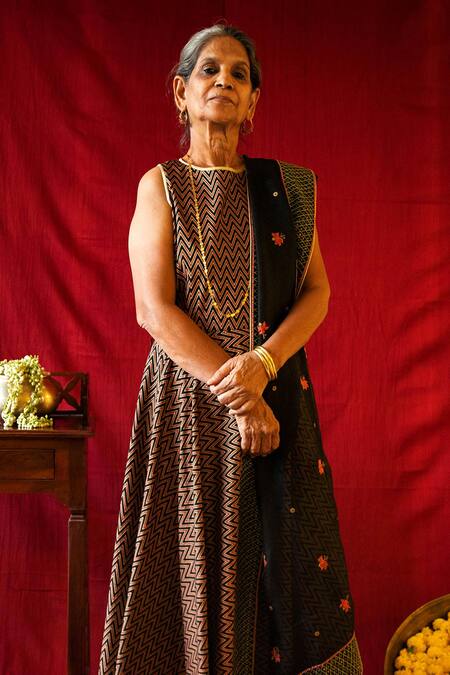 Black & brown flared long tunic with all-over block print chevron motifs & handloom cotton gold-tone detail.