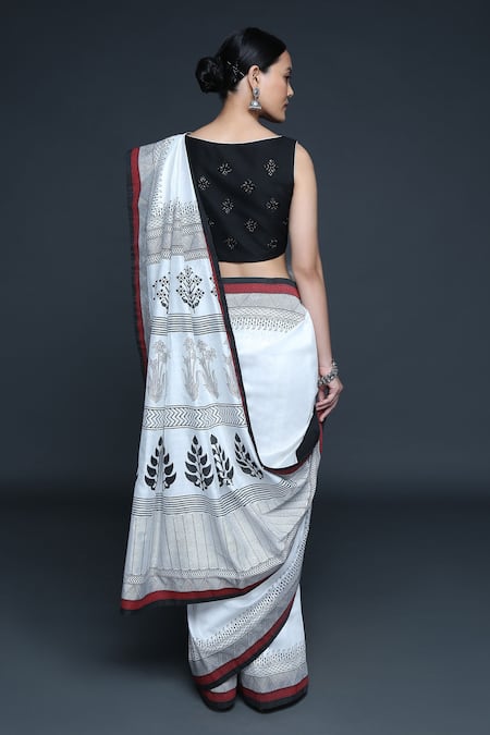 Ivory, black, and red chanderi saree featuring a geometric motif hand block print. Paired with a sleeveless embroidered blouse adorned with fine cut beads.