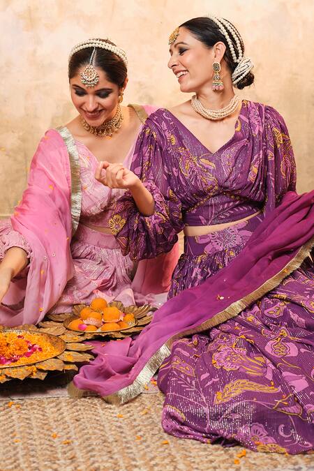 Pink lehenga featuring all over chintz flora print with lurex stripes detailing. Paired with a peasant sleeves ruched bustier style blouse and a matching kiran lace border dupatta.