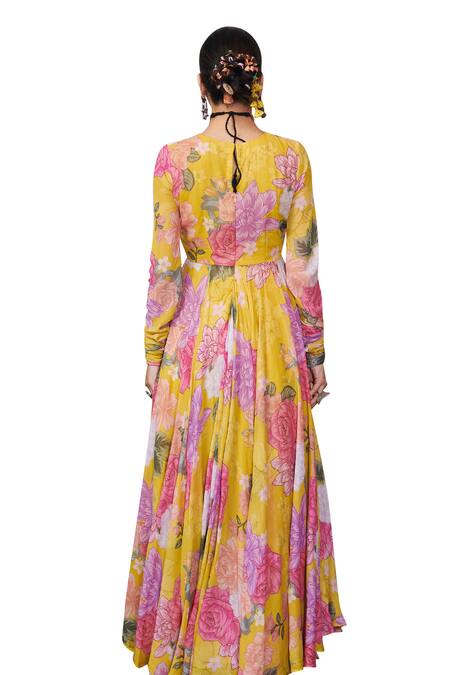Yellow floral printed anarkali featuring long gathered sleeves and round neckline. Paired with a matching dupatta and pant.