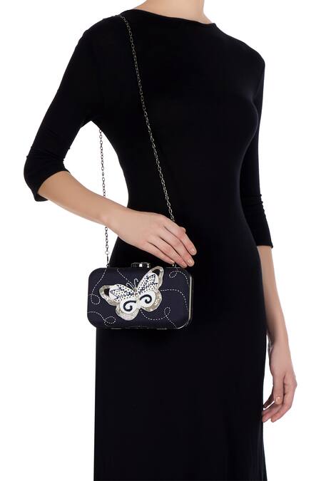 Created with perfect attention to detail, this blue silk rectangle clutch is enhanced with a 3D butterfly patch detail in faux leather and beadwork embroidery. Team up with a vibrant kurta set ensemble.
