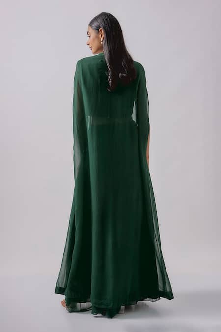 Green floral embroidered blouse featuring a round neckline and sleeveless design. Paired with a flowing cape and flared palazzo, both in georgette fabric, showcasing an embellished border and cape sleeves.