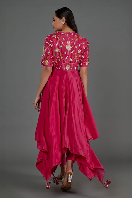 Pink asymmetric kurta featuring floral and thread embroidery with a round neckline and half sleeves