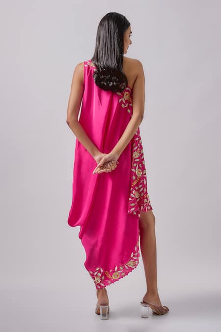 Hot pink one-shoulder dress featuring floral and thread embroidery on the neckline and hem