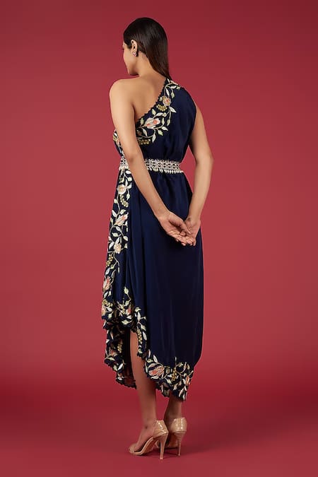 Deep blue crepe one-shoulder dress featuring floral and thread embroidery at the neckline and hem