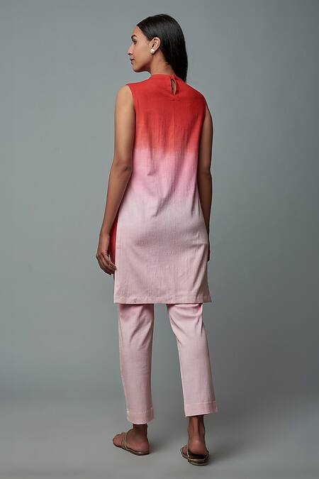 Red Cotton Round Neck Shaded Panelled Cut-out Top With Pant