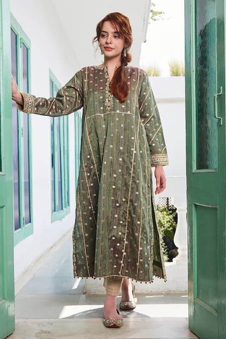 Green Silk Cotton Woven Floral Notched Hena Two Tone Kurta Pant Set