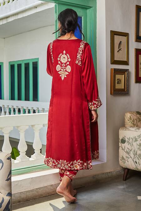 Maroon Modal Satin Silk Embroidered Floral Notched Kesar Kurta Pant Set