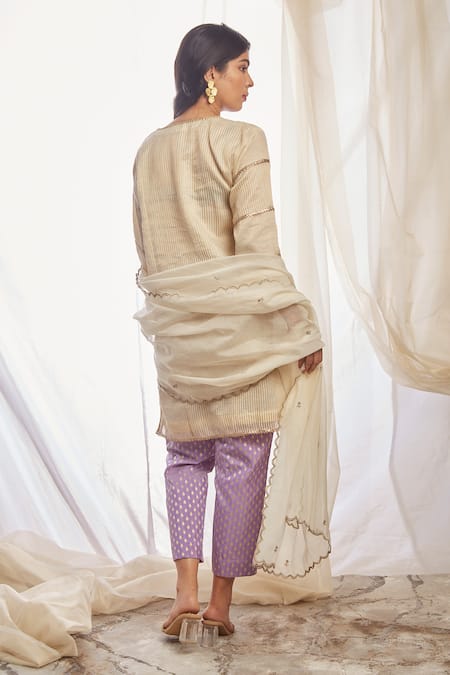 Off white kurta featuring lace embellishments and a V neck. Paired with a Banarasi pant and a scalloped dupatta.