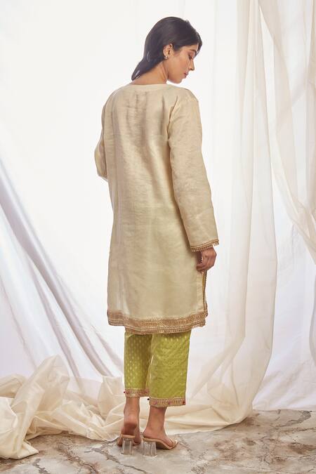 Off White Cotton Zari Embellished Lace Round Mogra Short Kurta And Banarasi Pant