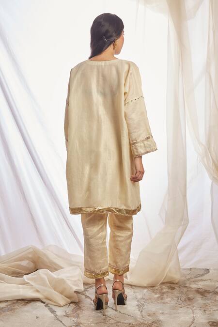 Off white kurta featuring round neckline, long sleeves, and embellished with gold lappa lace. Paired with matching pants that also have embellishments.