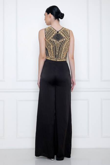 Buy_Dilnaz_Black Pure Silk Satin Embellished Sequin And Beads Bodice Jumpsuit _at_Aza_Fashions
