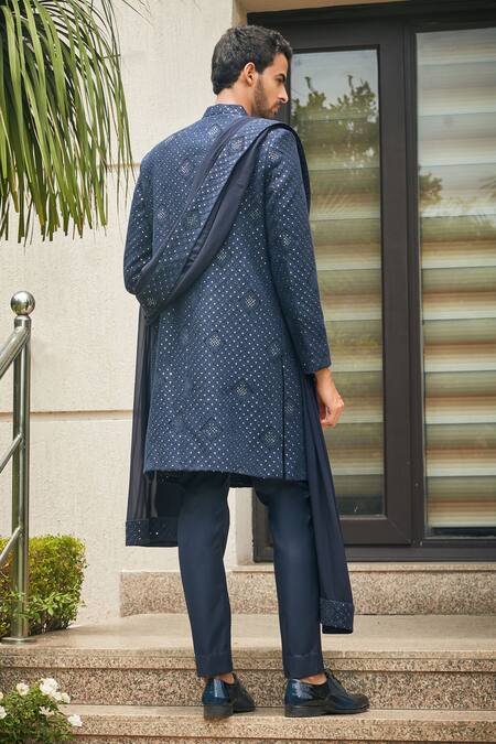 Navy blue sherwani featuring floral Mughal chikankari embroidery and sequin highlights. Paired with a matching dupatta, short kurta, and pant.