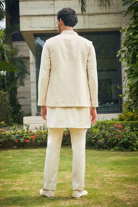 Beige bundi featuring floral Mughal chikankari embroidery and sequin highlights. Paired with a matching kurta and churidar in terrywool fabric.