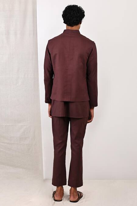 Dark mahogany bundi with front button detailing. Paired with kurta & pant.