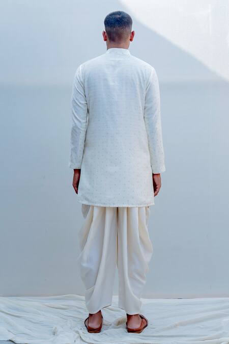 Off white asymmetric overlap kurta with woven motifs & asymmetric button placket. Paired with dhoti pant.