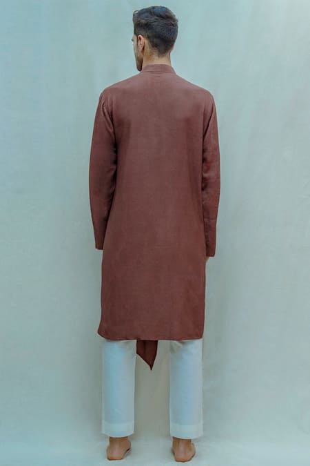 Brown knee-length kurta with asymmetric overlap placket. Comes with white pants.