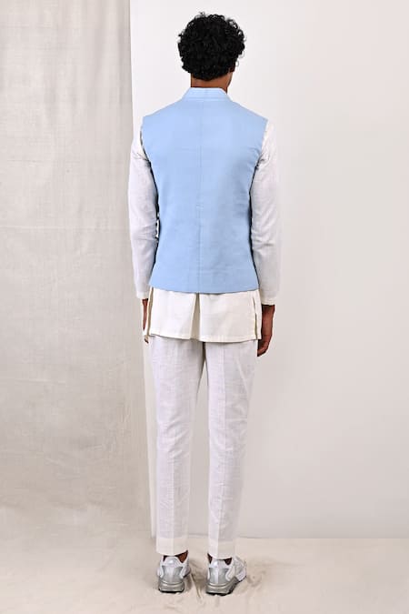 Sky blue bundi with front button detailing. Paired with overlap kurta & pant.
