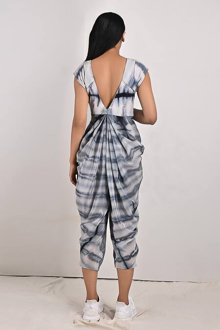 Light grey cap sleeve jumpsuit with tie & dye print & draped bottoms.