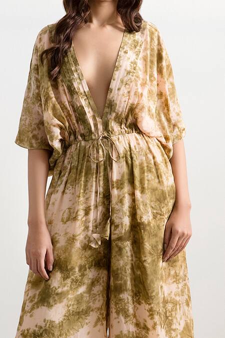 Tie & dye jumpsuit >Kaftan style bodice >Pleated yoke >Tie-up at empire waist